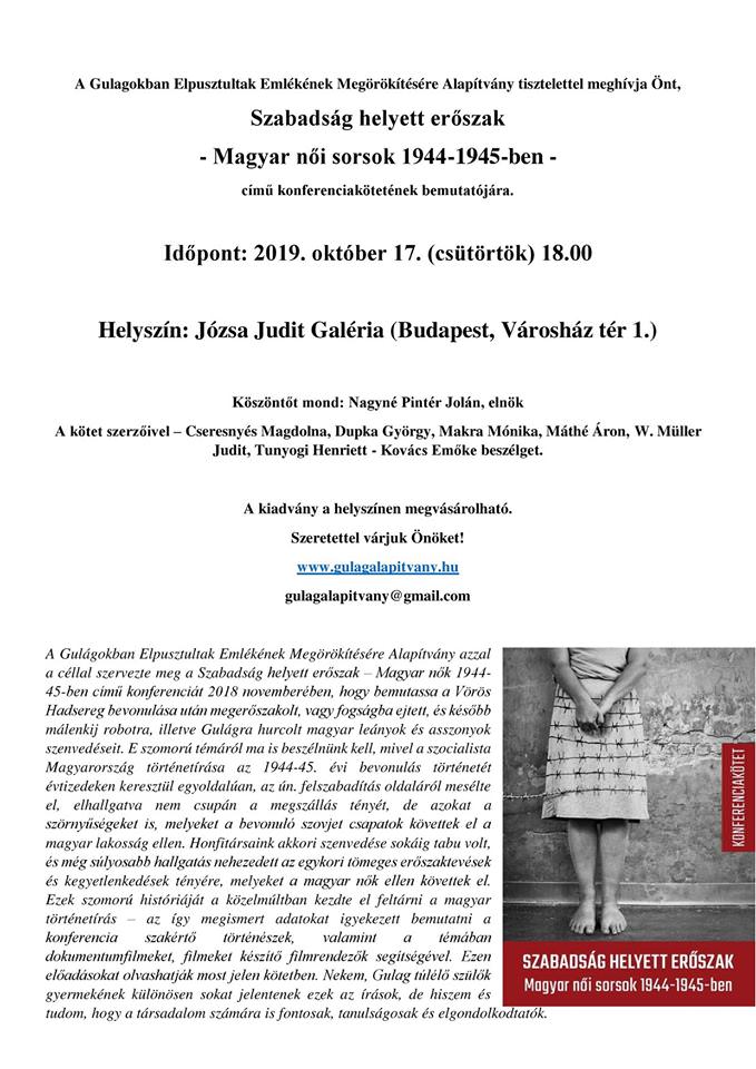 Szabadság helyett erőszak** - Magyar női sorsok 1944-1945-ben - című konferenciakötetének bemutatójára.** ** Időpont: 2019. október 17. (csütörtök) 18.00** ** Helyszín: Józsa Judit Galéria (Budapest, Városház tér 1.)**