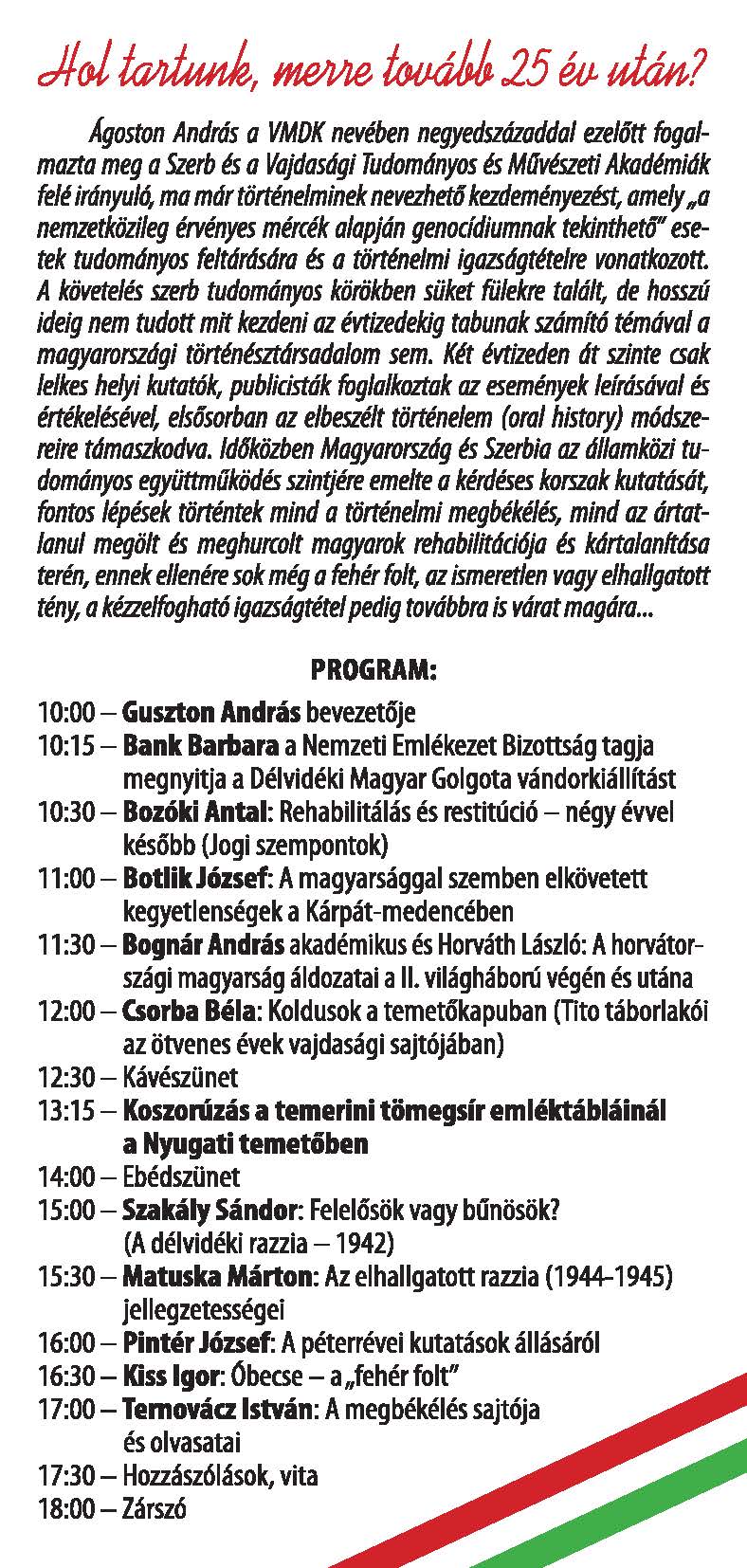 Ágoston András a VMDK nevében negyedszázaddal ezelőtt fogalmazta meg a Szerb és a Vajdasági Tudományos és Művészeti Akadémiák felé irányuló, ma már történelminek nevezhető kezdeményezést, amely "a nemzetközileg érvényes mércék alapján genocídiumnak tekinthető" esetek tudományos feltárására és a történelmi igazságtételre vonatkozott. A követelés szerb tudományos körökben süket fülekre talált, de hosszú ideig nem tudott mit kezdeni az évtizedekig tabunak számító témával a magyarországi történésztársadalom sem. Két évtizeden át szinte csak lelkes helyi kutatók, publicisták foglalkoztak az események leírásával és értékelésével, elsősorban az elbeszélt történelem (oral history) módszereire támaszkodva. Időközben Magyarország és Szerbia az államközi tudományos együttműködés szintjére emelte a kérdéses korszak kutatását, fontos lépések történtek mind a történelmi megbékélés, mind az ártatlanul megölt és meghurcolt magyarok rehabilitációja és kártalanítása terén, ennek ellenére sok még a fehér folt, az ismeretlen vagy elhallgatott tény, a kézzelfogható igazságtétel pedig továbbra is várat magára...