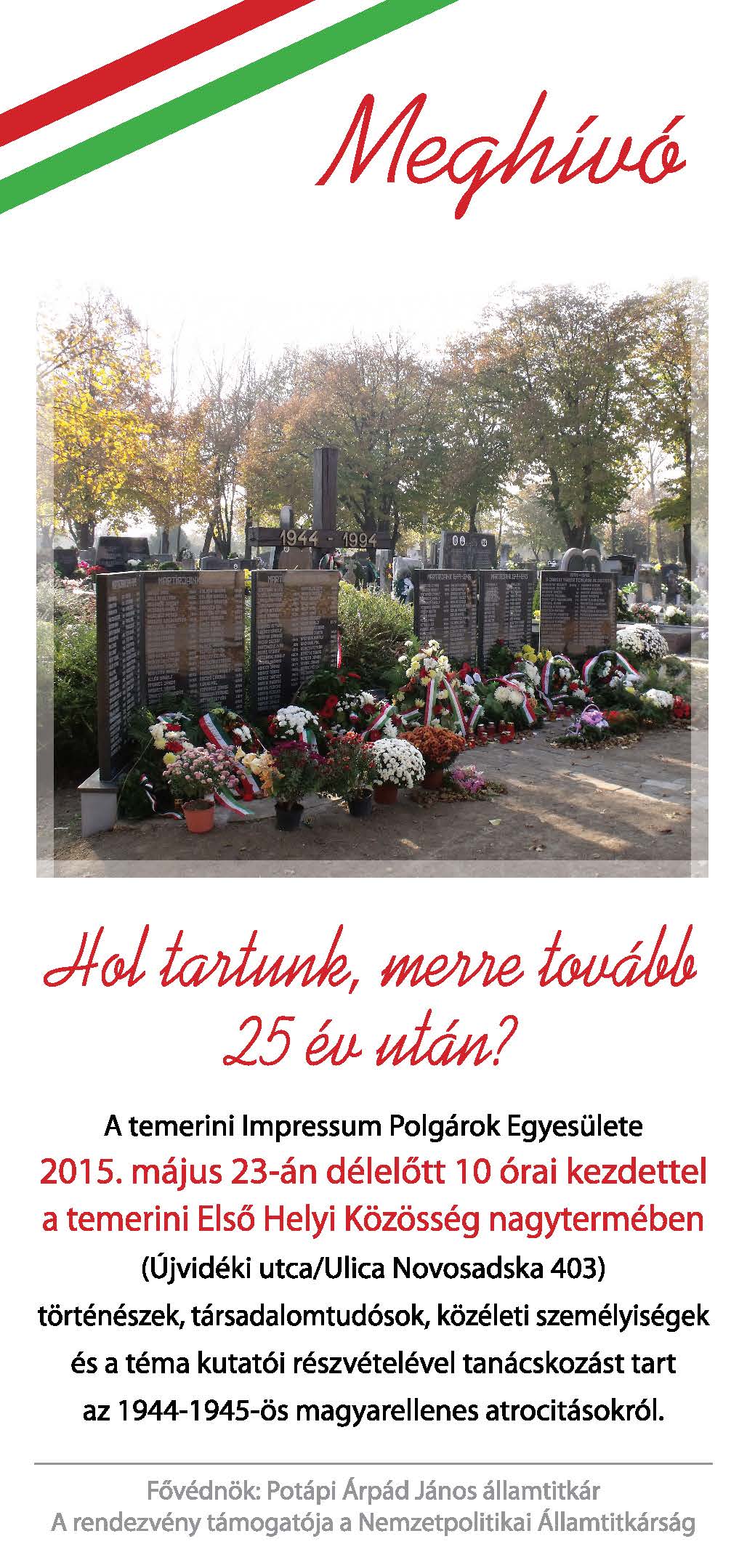 13:15- Koszorúzás a temerini tömegsír emléktábláinál a Nyugati temetőben
