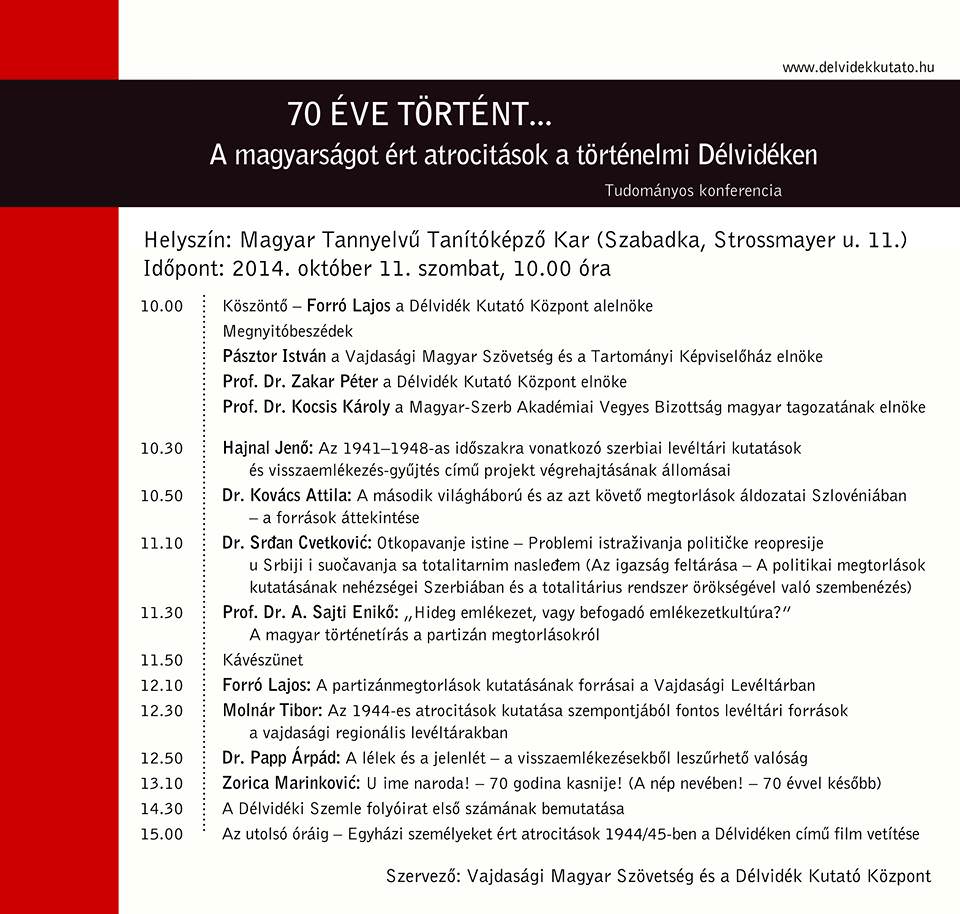 70 éve történt... A magyarságot ért atrocitások a történelmi Délvidékencímmel tudományos konferenciát szervezett a Vajdasági Magyar Szövetség és a Délvidék Kutató Központ szombaton Szabadkán.